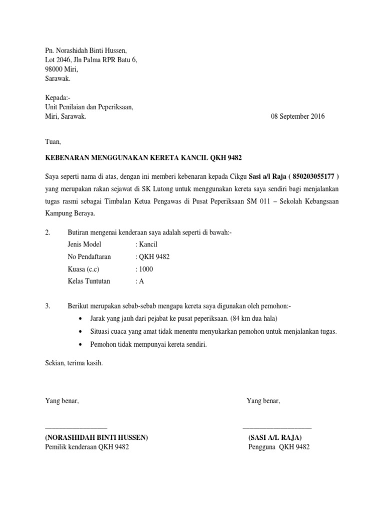 Contoh Surat Kebenaran Menggunakan Kenderaan Syarikat Letter 7saudara Com