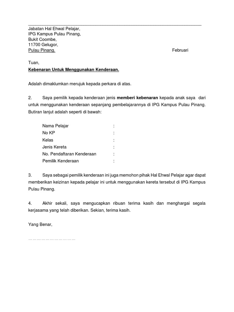 660 Manual memberi kebenaran kepada anak saya Ahmad Asyraf Bin Jamaluddin dari PISMP Tahun 3 kelas Matematik 2 untuk menggunakan kenderaan sepanjang pembelajarannya di IPG Kampus Pulau Pinang. More Documents from Eric Wynn Surat Kebenaran Membawa Kenderaan 1 December 2019 626. Contoh Surat Rasmi Untuk Bank Surat rasmi untuk buka akaun bank lowongan kerja jakarta terbaru via jakartalowongankerjaterbaru contoh surat rasmi tukar akaun bank rasmi j via rasmij surat.